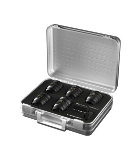 - Estuche rígido de aluminio para un conjunto de cuatro objetivos, lo suficientemente pequeño para guardarlo en una maleta de cabina y ligero para llevarlo de viaje con una correa para el hombro incluida.