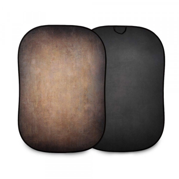 El fondo plegable Vintage Collapsible 1,5 x 2,1m Walnut (nuez)/Pewter (peltre) presenta en el lado Walnut, una superficie rústica con textura de con tonos cálidos, que evocan el café y la madera antigua, con un contraste pronunciado. El lado del reverso (Pewter) presenta una superficie con una textura en moteada con tonos de gris y negro que sugieren el carboncillo o el ónix.